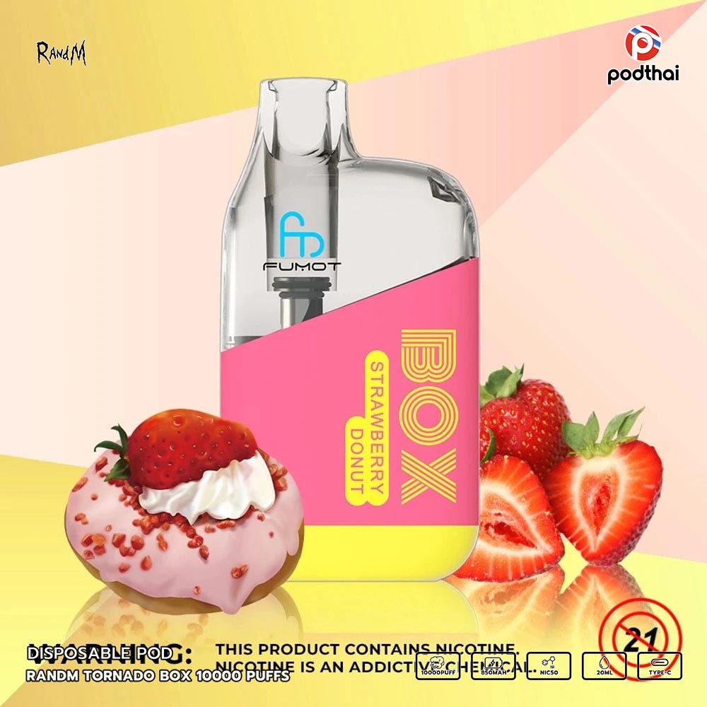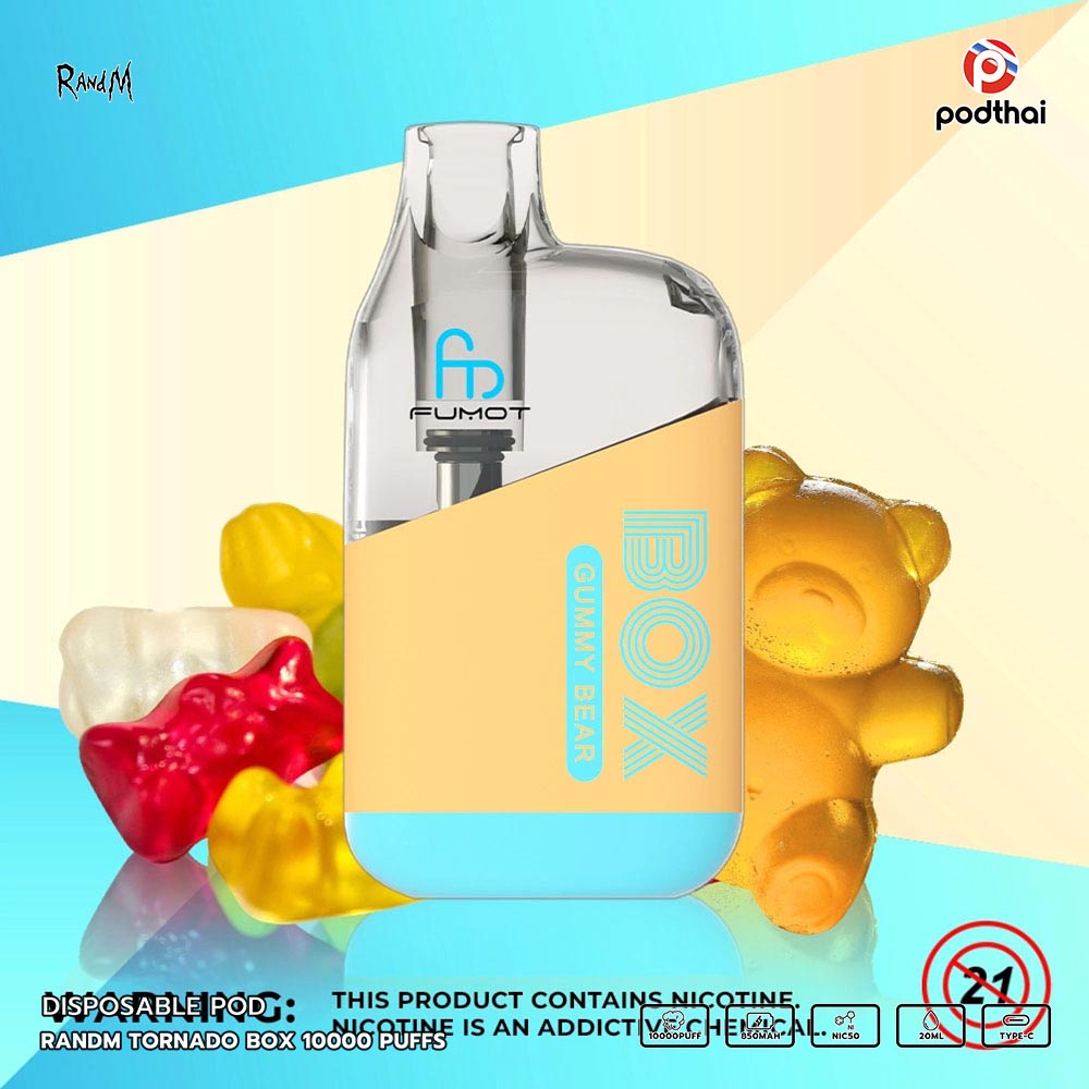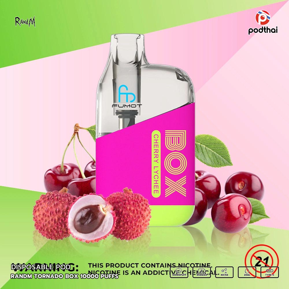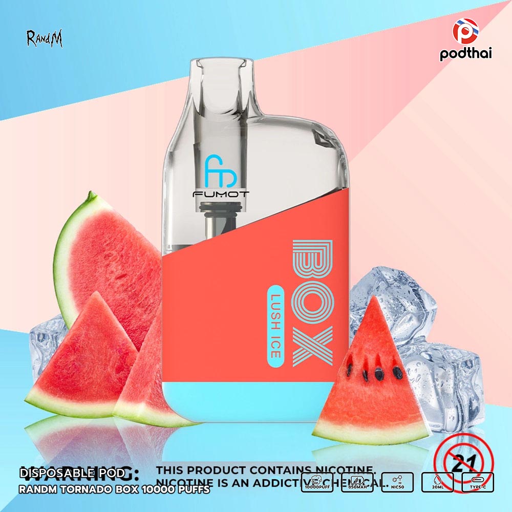 Randm Tornado Box 10000 Puffs แบบใช้แล้วทิ้งขายดีที่มีการออกแบบสวยเท่ สูบได้ทั้งวัน มีไฟ RGB ตอนสูบ เหมาะกับสายตี้ และสามารถชาร์จใหม่ได้ด้วยสาย Type-C แบบชาร์จได้อย่างเร็ว มี 22 กลิ่นรสชาติใหม่ที่เข้ากันได้อย่างลงตัว ประเภทคอยล์มาแบบ Mesh Coil (1.0ohm) และยังสามรถปรับรูลมได้อีกด้วยที่ท้ายเครื่อง กลิ่นและควันชัดๆ หวานหอมแบตเตอรี่ความจุ 850mAh การจุน้ำยา 20 ml มีความเข้มข้นนิโคติน 5% (Nic50) อิ่มๆ สูบได้สูงสุดอยู่ที่ 10000 คำเทียบกับบุหรี่ถึง 500 มวลเลยทีเดียว